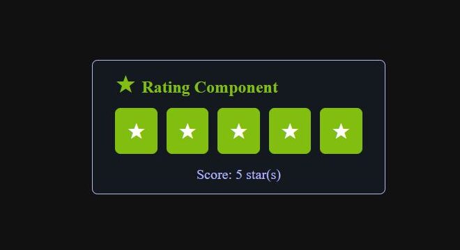 <div class="rating"> <div class="title"> <span>★</span> <span class="label">Rating Component</span> </div> <div class="star-container"> <span class="star" data-value="1">★</span> <span class="star" data-value="2">★</span> <span class="star" data-value="3">★</span> <span class="star" data-value="4">★</span> <span class="star" data-value="5">★</span> </div> <span id="ratingScore" class="score-label">Score: 0 star(s)</span> </div>