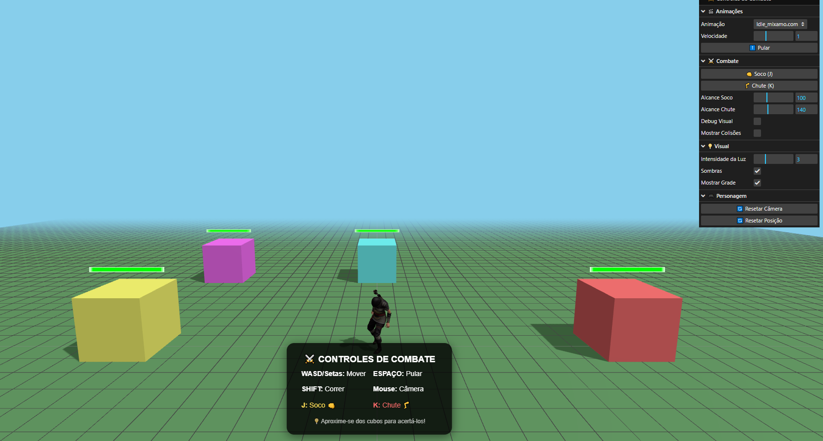 import * as THREE from "three";import { OrbitControls } from "three/addons/controls/OrbitControls.js";import { FBXLoader } from "three/addons/loaders/FBXLoader.js";import { GUI } from "three/addons/libs/lil-gui.module.min.js";// ===================================// CONFIGURAÇÕES GLOBAIS// ===================================const CONFIG = { // Movimento MOVEMENT_SPEED: 200, ROTATION_SPEED: 8, RUN_SPEED_MULTIPLIER: 1.5, // Física do pulo JUMP_VELOCITY: 70, GRAVITY: -180, MAX_FALL_SPEED: -300, GROUND_LEVEL: 0, COYOTE_TIME: 0.15, // Animação ANIMATION_FADE_DURATION: 0.15, JUMP_UP_THRESHOLD: 10, JUMP_DOWN_THRESHOLD: -10, // Câmera CAMERA_FOV: 65, CAMERA_DISTANCE: 280, CAMERA_HEIGHT: 140, CAMERA_FOLLOW_SMOOTHNESS: 0.08, // Visual MODEL_SCALE: 0.3, SHADOW_MAP_SIZE: 2048, // Sistema de Combate com Física ATTACK: { PUNCH: { COOLDOWN: 0.5, MIN_RANGE: 20, // Distância mínima MAX_RANGE: 100, // Distância máxima ANGLE: Math.PI / 3, // Ângulo do cone FORCE: 250, // Força do impulso KNOCKBACK: 0.8, // Multiplicador de knockback HIT_WINDOW: 0.25, // Quando o hit acontece DURATION: 0.6, DAMAGE: 15, }, KICK: { COOLDOWN: 0.8, MIN_RANGE: 30, MAX_RANGE: 140, ANGLE: Math.PI / 2.5, FORCE: 450, KNOCKBACK: 1.5, HIT_WINDOW: 0.35, DURATION: 0.9, DAMAGE: 25, }, }, // Física dos objetos PHYSICS: { FRICTION: 0.92, // Atrito do chão AIR_RESISTANCE: 0.98, // Resistência do ar BOUNCE: 0.3, // Quão elástico é o objeto ROTATION_DAMPING: 0.95, // Amortecimento da rotação MIN_VELOCITY: 0.01, // Velocidade mínima antes de parar }, // Colisão CHARACTER_RADIUS: 30, // Raio de colisão do personagem OBJECT_RADIUS: 35, // Raio de colisão dos cubos (metade da diagonal)};// ===================================// MÓDULO: OBJETO COM FÍSICA// ===================================class PhysicsObject { constructor(mesh) { this.mesh = mesh; this.velocity = new THREE.Vector3(0, 0, 0); this.angularVelocity = new THREE.Vector3(0, 0, 0); this.mass = 1.0; this.isGrounded = false; this.health = 100; this.maxHealth = 100; // Cria barra de vida this.createHealthBar(); } createHealthBar() { const barWidth = 60; const barHeight = 4; const canvas = document.createElement("canvas"); canvas.width = 128; canvas.height = 32; const ctx = canvas.getContext("2d"); const texture = new THREE.CanvasTexture(canvas); const material = new THREE.SpriteMaterial({ map: texture }); this.healthBar = new THREE.Sprite(material); this.healthBar.scale.set(barWidth, barHeight, 1); this.mesh.add(this.healthBar); this.healthBar.position.set(0, 40, 0); this.healthBarCanvas = canvas; this.healthBarCtx = ctx; this.updateHealthBar(); } updateHealthBar() { const ctx = this.healthBarCtx; const canvas = this.healthBarCanvas; ctx.clearRect(0, 0, canvas.width, canvas.height); // Fundo ctx.fillStyle = "rgba(0, 0, 0, 0.5)"; ctx.fillRect(0, 0, canvas.width, canvas.height); // Barra de vida const healthPercent = this.health / this.maxHealth; const barWidth = canvas.width * healthPercent; // Cor baseada na vida if (healthPercent > 0.6) { ctx.fillStyle = "#00ff00"; } else if (healthPercent > 0.3) { ctx.fillStyle = "#ffff00"; } else { ctx.fillStyle = "#ff0000"; } ctx.fillRect(0, 0, barWidth, canvas.height); // Borda ctx.strokeStyle = "#ffffff"; ctx.lineWidth = 2; ctx.strokeRect(1, 1, canvas.width - 2, canvas.height - 2); this.healthBar.material.map.needsUpdate = true; } applyForce(force, point) { // Aplica força linear this.velocity.add(force.clone().multiplyScalar(1 / this.mass)); // Aplica torque (rotação) baseado no ponto de impacto const centerToPoint = point.clone().sub(this.mesh.position); const torque = new THREE.Vector3().crossVectors(centerToPoint, force); this.angularVelocity.add(torque.multiplyScalar(0.01 / this.mass)); } takeDamage(amount) { this.health = Math.max(0, this.health - amount); this.updateHealthBar(); if (this.health <= 0) { this.onDestroy(); } } onDestroy() { // Efeito de destruição const material = this.mesh.material; const originalColor = material.color.clone(); let opacity = 1; const fadeOut = () => { opacity -= 0.05; material.opacity = opacity; material.transparent = true; if (opacity > 0) { requestAnimationFrame(fadeOut); } else { this.mesh.visible = false; // Regenera após 5 segundos setTimeout(() => this.respawn(), 5000); } }; fadeOut(); } respawn() { this.health = this.maxHealth; this.velocity.set(0, 0, 0); this.angularVelocity.set(0, 0, 0); this.mesh.material.opacity = 1; this.mesh.material.transparent = false; this.mesh.visible = true; this.mesh.rotation.set(0, 0, 0); this.updateHealthBar(); } update(delta) { // Aplica gravidade if (!this.isGrounded) { this.velocity.y += CONFIG.GRAVITY * delta; } // Aplica velocidade this.mesh.position.add(this.velocity.clone().multiplyScalar(delta)); // Aplica rotação angular this.mesh.rotation.x += this.angularVelocity.x * delta; this.mesh.rotation.y += this.angularVelocity.y * delta; this.mesh.rotation.z += this.angularVelocity.z * delta; // Colisão com o chão const groundY = 25; // Altura do centro do cubo if (this.mesh.position.y <= groundY) { this.mesh.position.y = groundY; // Bounce if (Math.abs(this.velocity.y) > 5) { this.velocity.y *= -CONFIG.PHYSICS.BOUNCE; } else { this.velocity.y = 0; this.isGrounded = true; } } else { this.isGrounded = false; } // Aplicar atrito if (this.isGrounded) { this.velocity.x *= CONFIG.PHYSICS.FRICTION; this.velocity.z *= CONFIG.PHYSICS.FRICTION; this.angularVelocity.multiplyScalar(CONFIG.PHYSICS.ROTATION_DAMPING); } else { // Resistência do ar this.velocity.x *= CONFIG.PHYSICS.AIR_RESISTANCE; this.velocity.z *= CONFIG.PHYSICS.AIR_RESISTANCE; } // Para o objeto se estiver muito devagar if (this.velocity.length() < CONFIG.PHYSICS.MIN_VELOCITY) { this.velocity.set(0, this.velocity.y, 0); } if (this.angularVelocity.length() < 0.01) { this.angularVelocity.set(0, 0, 0); } // Mantém a barra de vida sempre virada para a câmera if (this.healthBar) { this.healthBar.quaternion.copy(this.mesh.quaternion); } }}// ===================================// MÓDUL